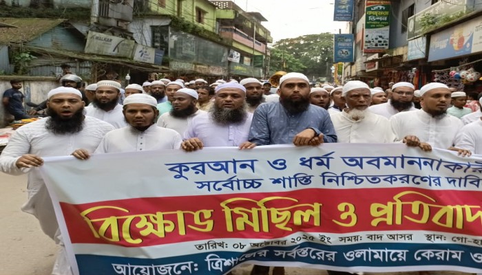 আজ বুধবার বিকালে ত্রিশালে সর্বস্তরের ওলামায়ে কেরাম ও তাওহীদ জনতা এক বিক্ষোভ মিছিল ও প্রতিবাদ সভা অনুষ্ঠিত হয়েছে।